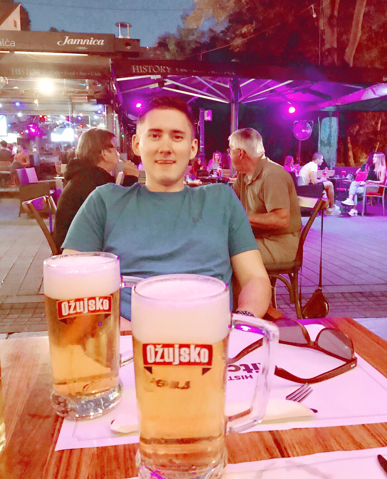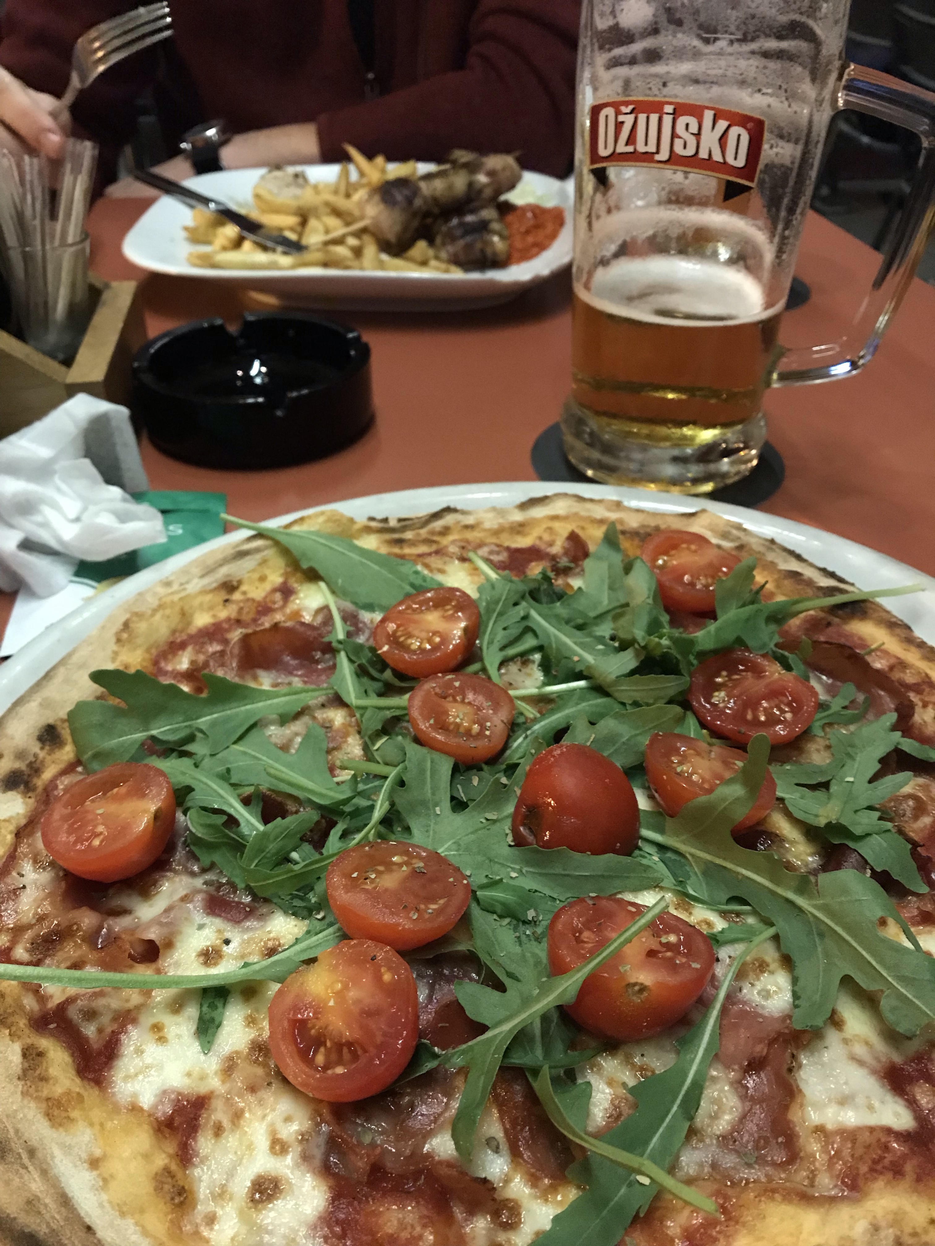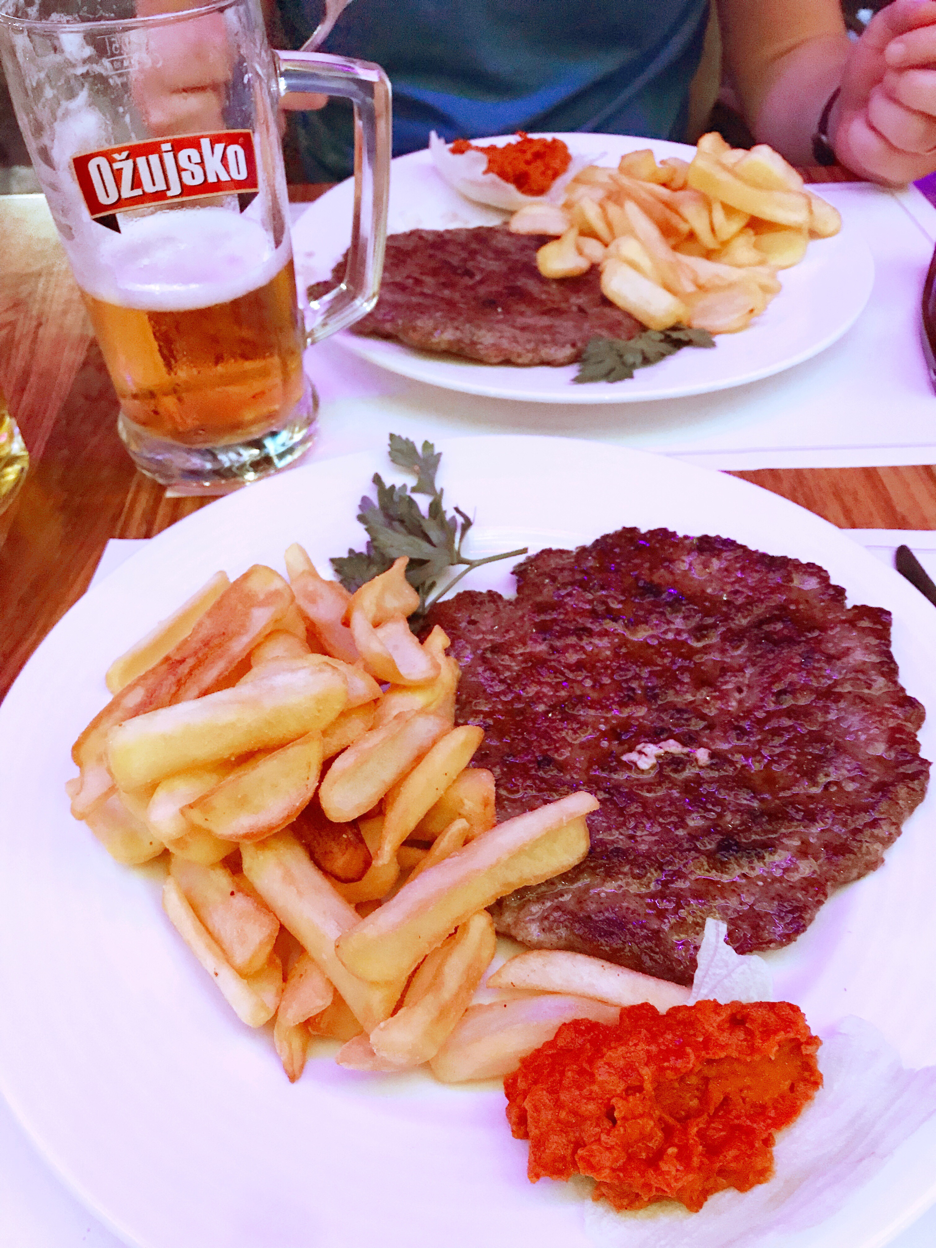 After 9 hours of travel (BOS > CDG > ZAG), we were ready for some food and beer. Manfriend has been talking about his favorite Croatian beer for years. Ozujsko is a Croatian beer that is easy to drink and light on flavor, but not like the dirty water of a Bud Light back home (sorry Bud fans!). The best part? You can drink it all day without getting drunk!