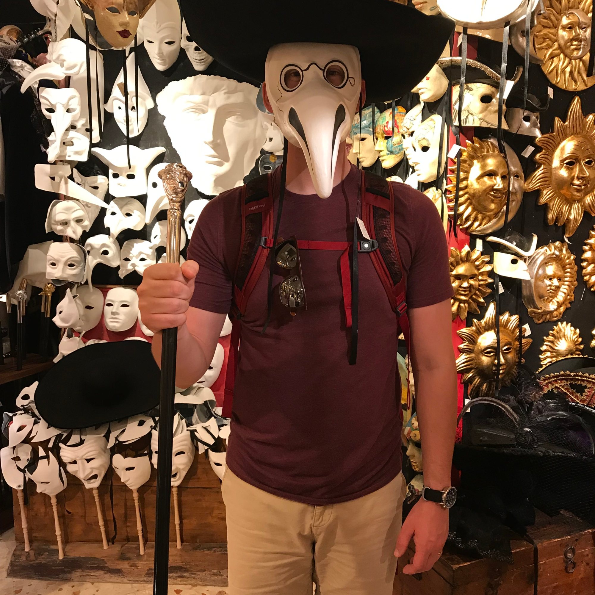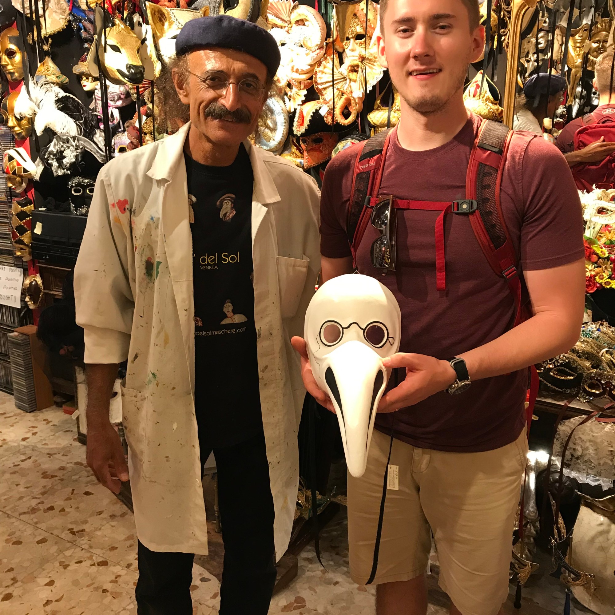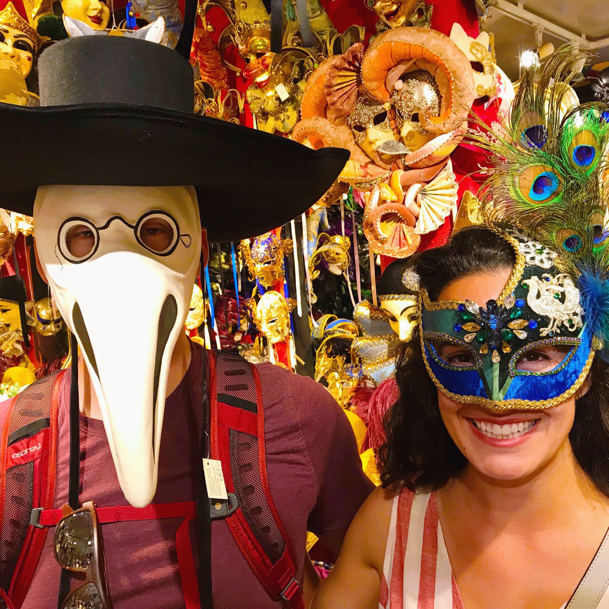 We found one shop, Ca’ Del Sol, with our favorite masks. We each bought one – Manfriend a plague death mask, and I bought a joker mask. The best part of this shop were meeting the gentleman who made the masks and who ran a school across the canal for mask making.