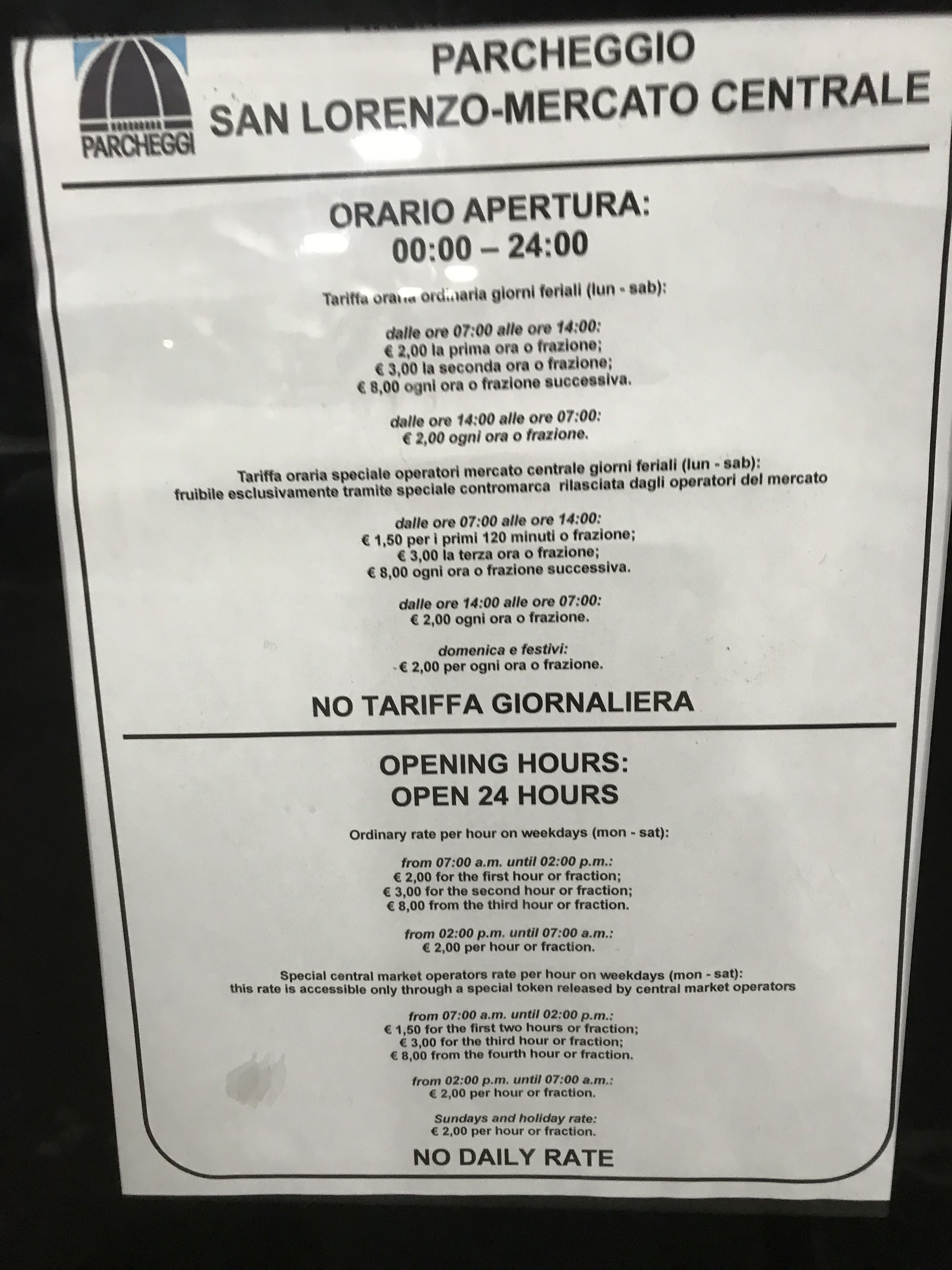 Firenze was one of the places I was most excited to see on our road trip across Italy. Leaving Bologna and getting back on the highway, we drove through hilly terrain with tunnels and tolls (tracked by the piece of paper in the first photo below). When we arrived in Florence, we parked in a covered garage pretty close to downtown.