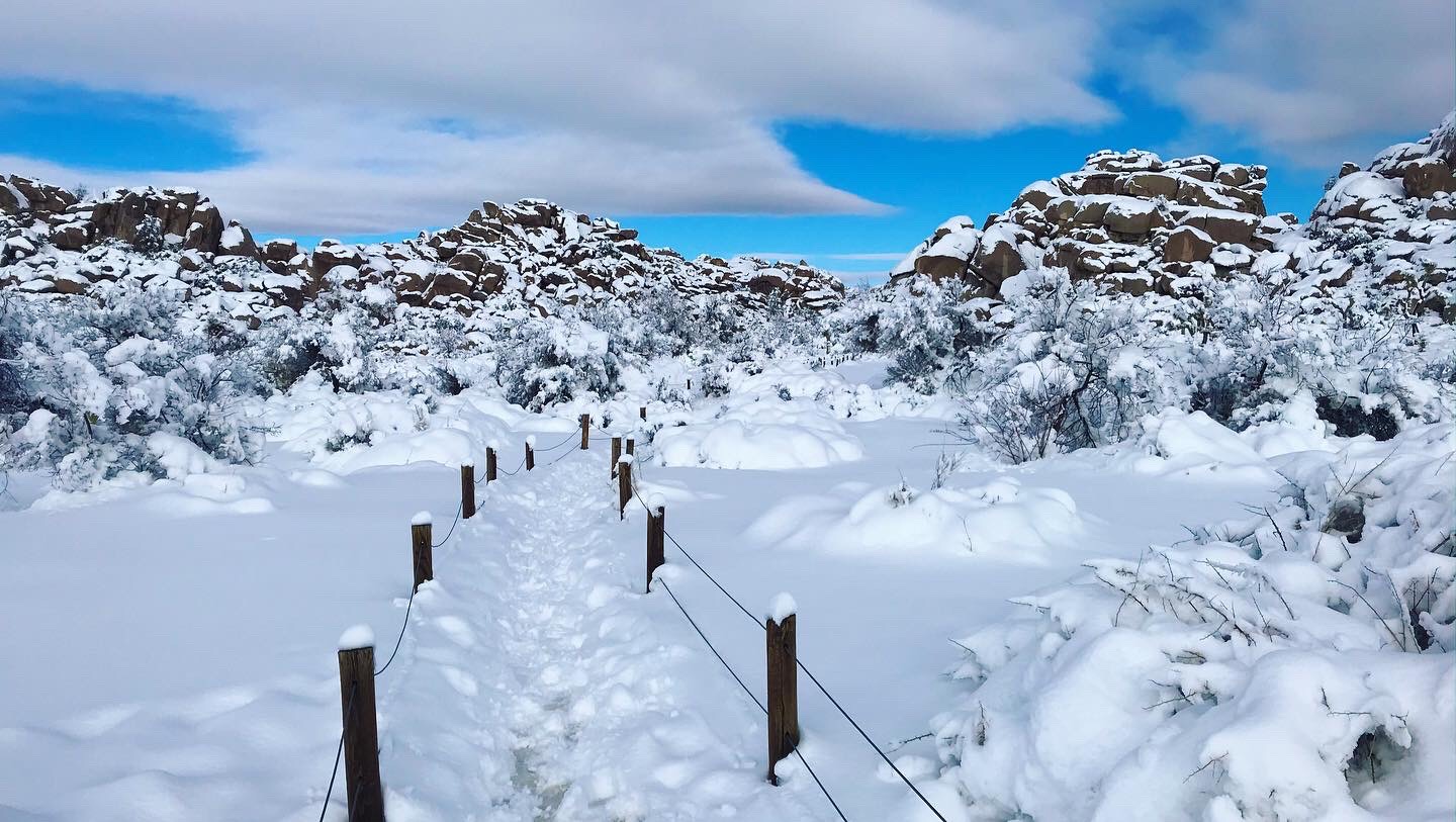 We did one hike – Barker Dam. A 1.1 mile loop, the trail was hard to identify in the snow, flooded out in many spots, but a relief to get out of the car and stomp around in the snow a bit!