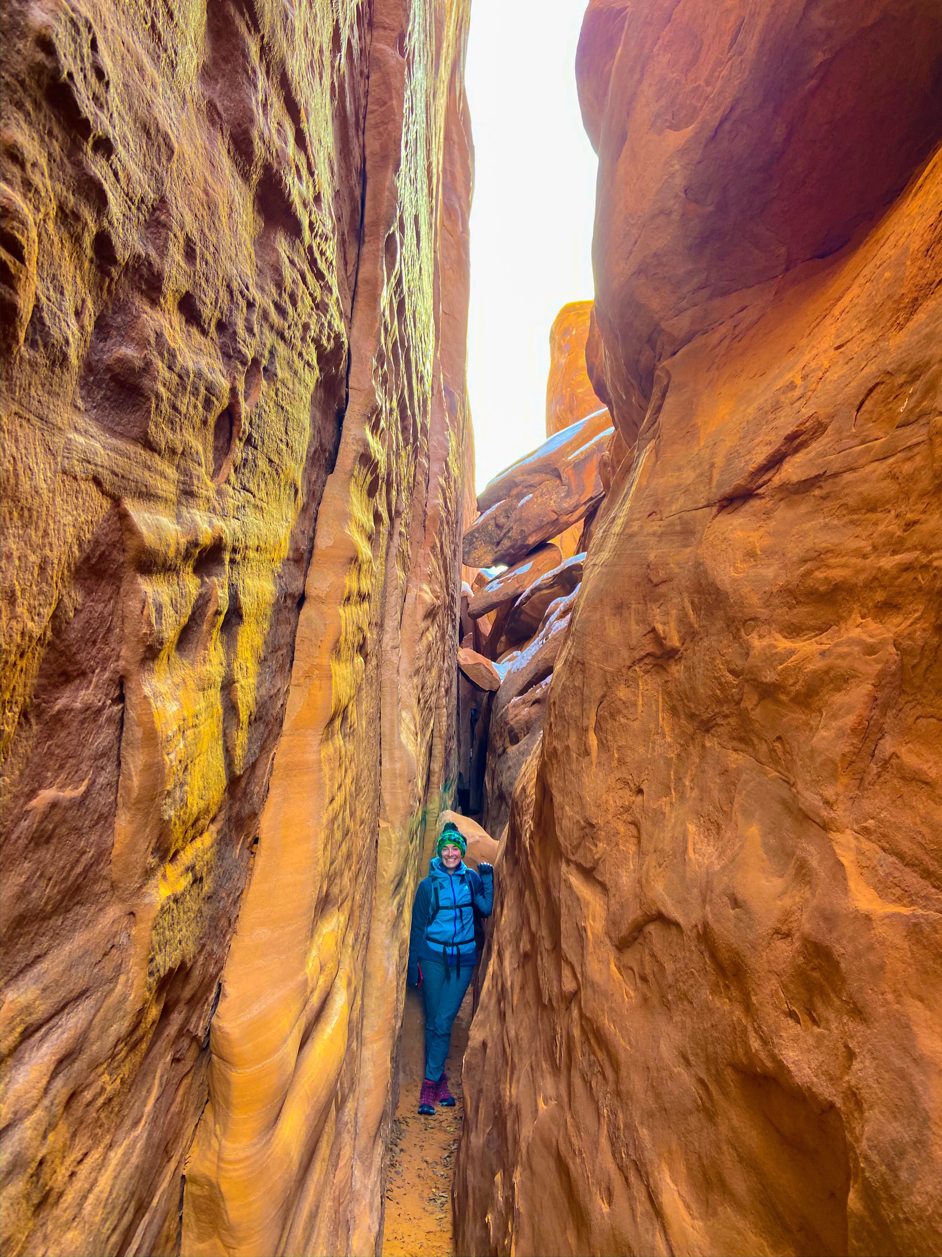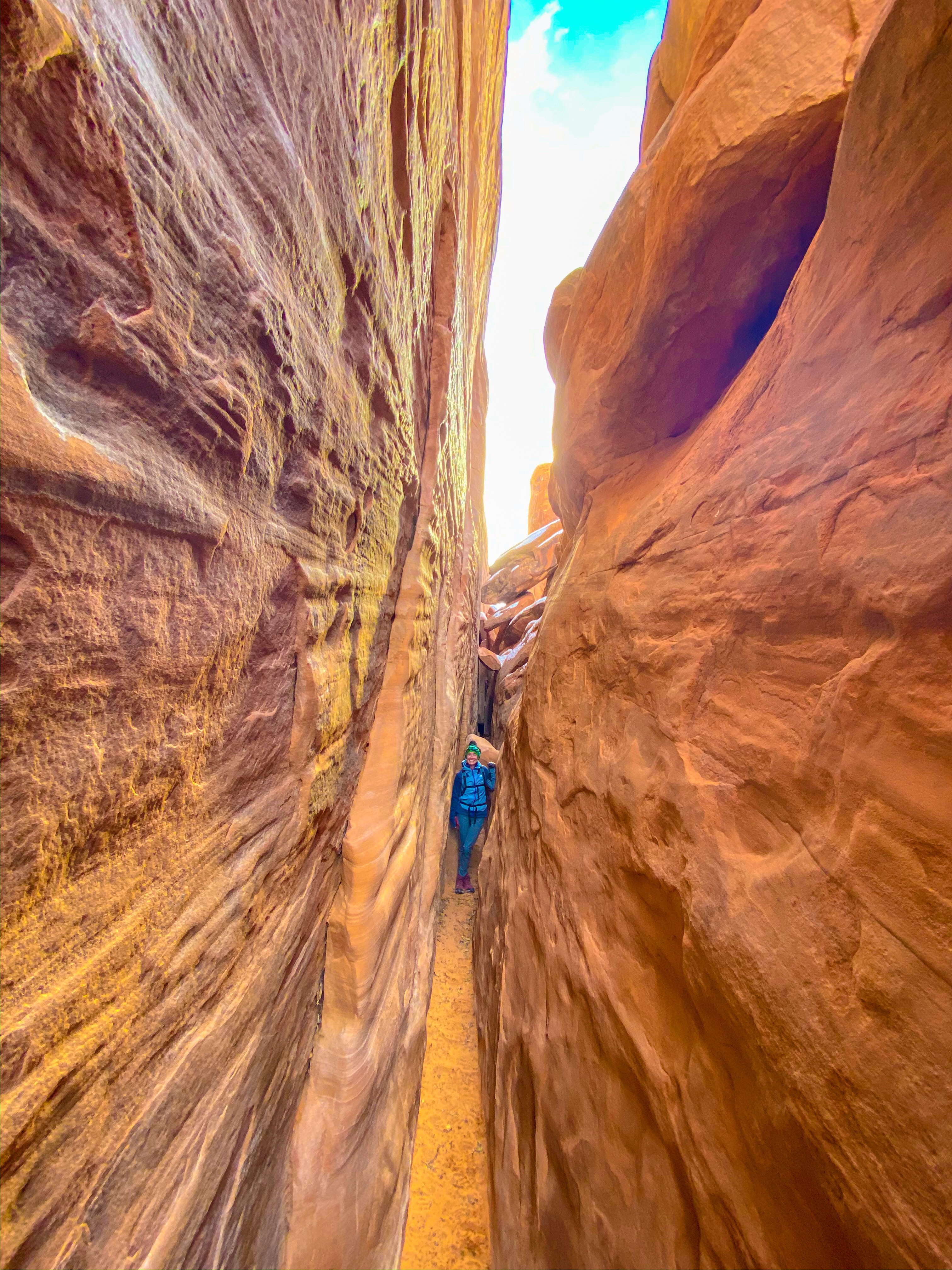 Hiding in the fins of rock, Sand Dune Arch was our first arch. Since we had seen myriad photos before we left of the others, we knew this one was small compared to others, but the way the light filled the canyon between the fins that hid this arch was incredible.