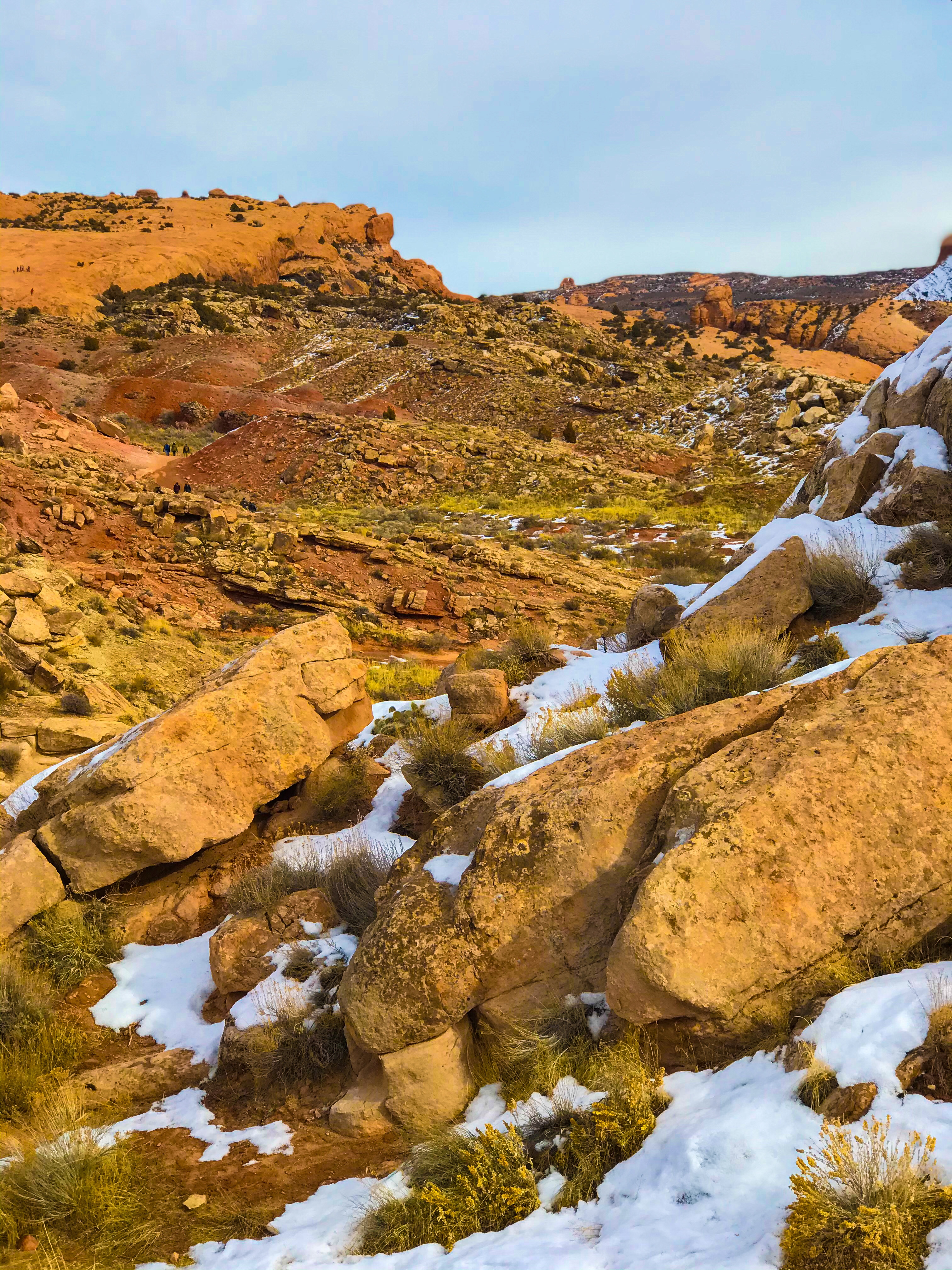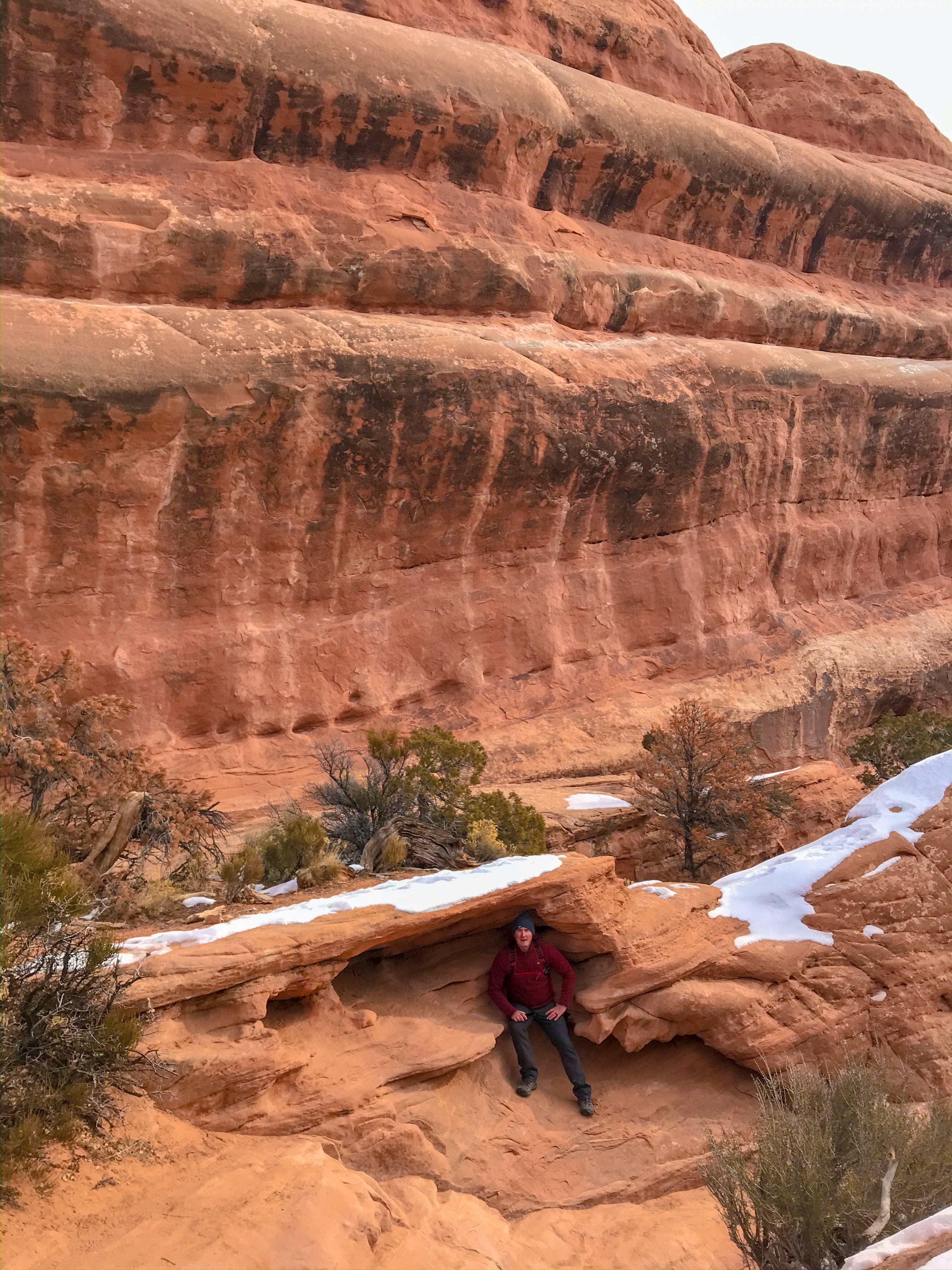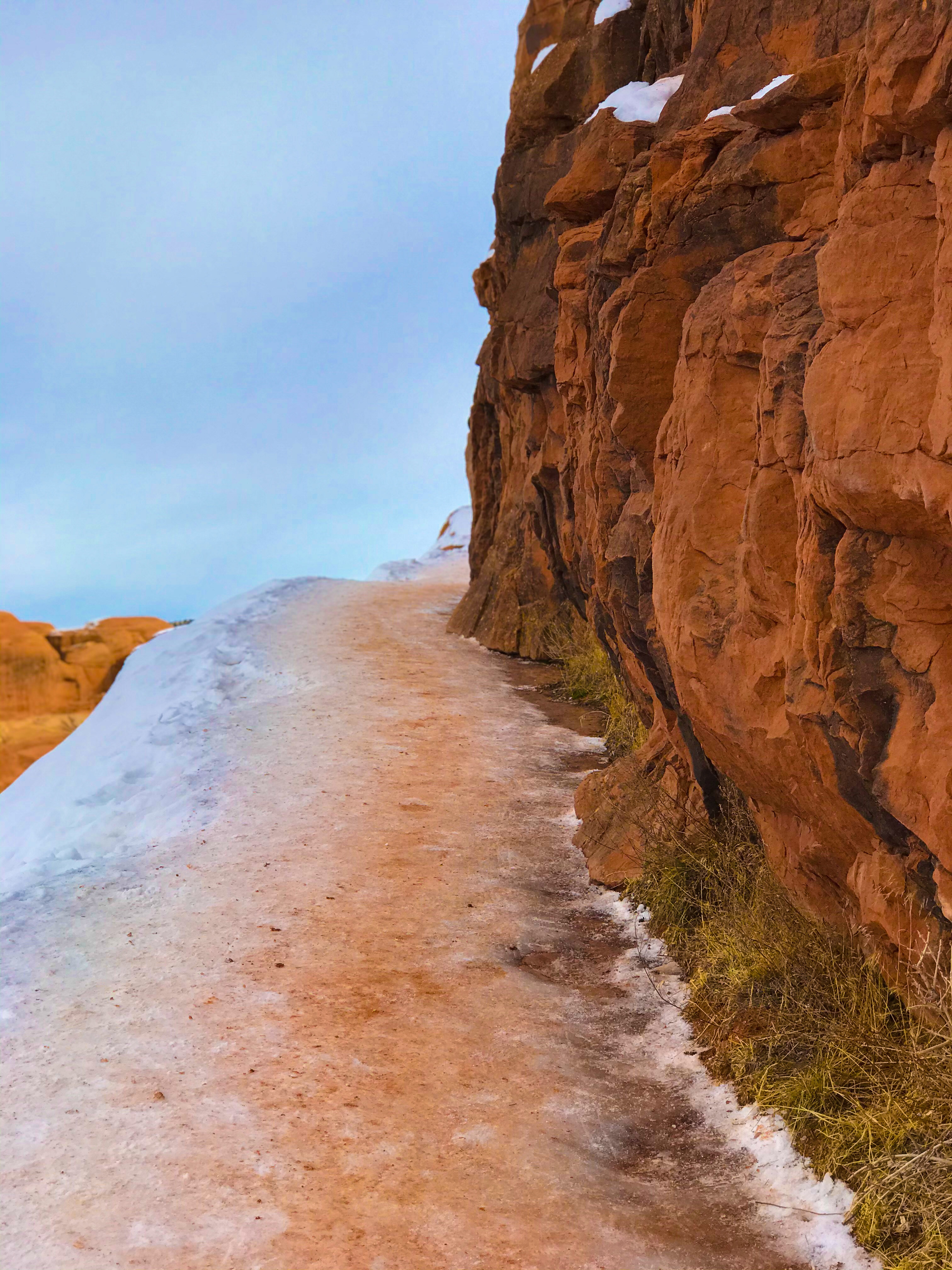 During the winter months, the park gets a decent amount of snow and a lot of ice. Hiking trails like Delicate Arch and Devil’s Playground Primitive Loop area near impassible without traction cleats – we have YakTrax, but also saw a number of people using Kahtoola’s for even more traction. We took them off most times when there was no longer a lot of snow and ice in an effort to protect the rocks (as you hike, you’ll see a lot of white, small scrapes from cleats), which was fine since they’re really easy to take on and off.